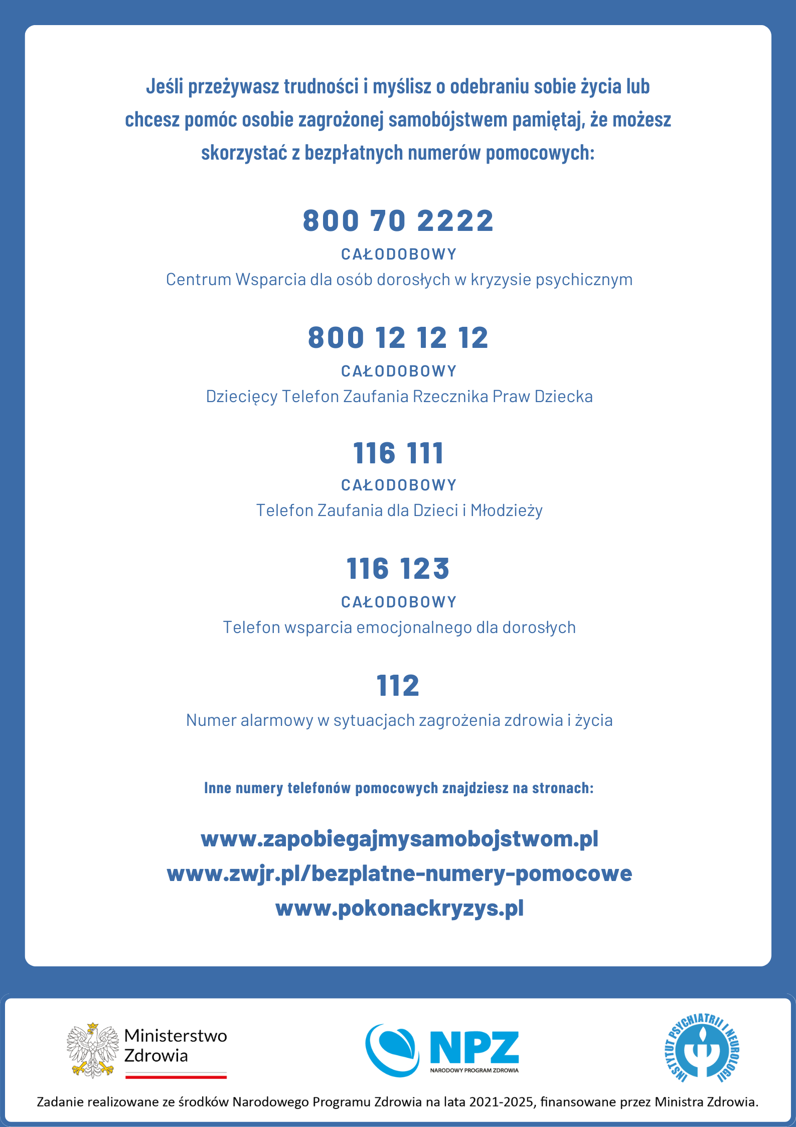 Telefony zaufania: 800702222 dla osób dorosłych w kryzysie psychicznym, 800121212 dziecięcy telefon zaufania Rzecznika Praw Dziecka, 116111 Telefon zaufania dla Dzieci i Młodzieży
